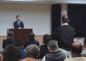 続けて市長も挨拶で、議会報告を兼ね、福祉、教育等の裏付けの財源として交付金等がある、加えて稼ぐ力を持って、ふるさと納税と競輪事業も予算の両輪とする旨を述べました。
