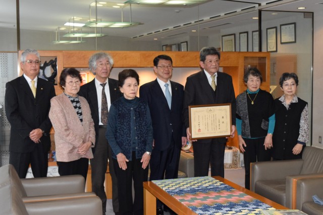 小野市長と記念撮影する県知事褒賞の久保田さん(右から3人目)ら=伊東市役所